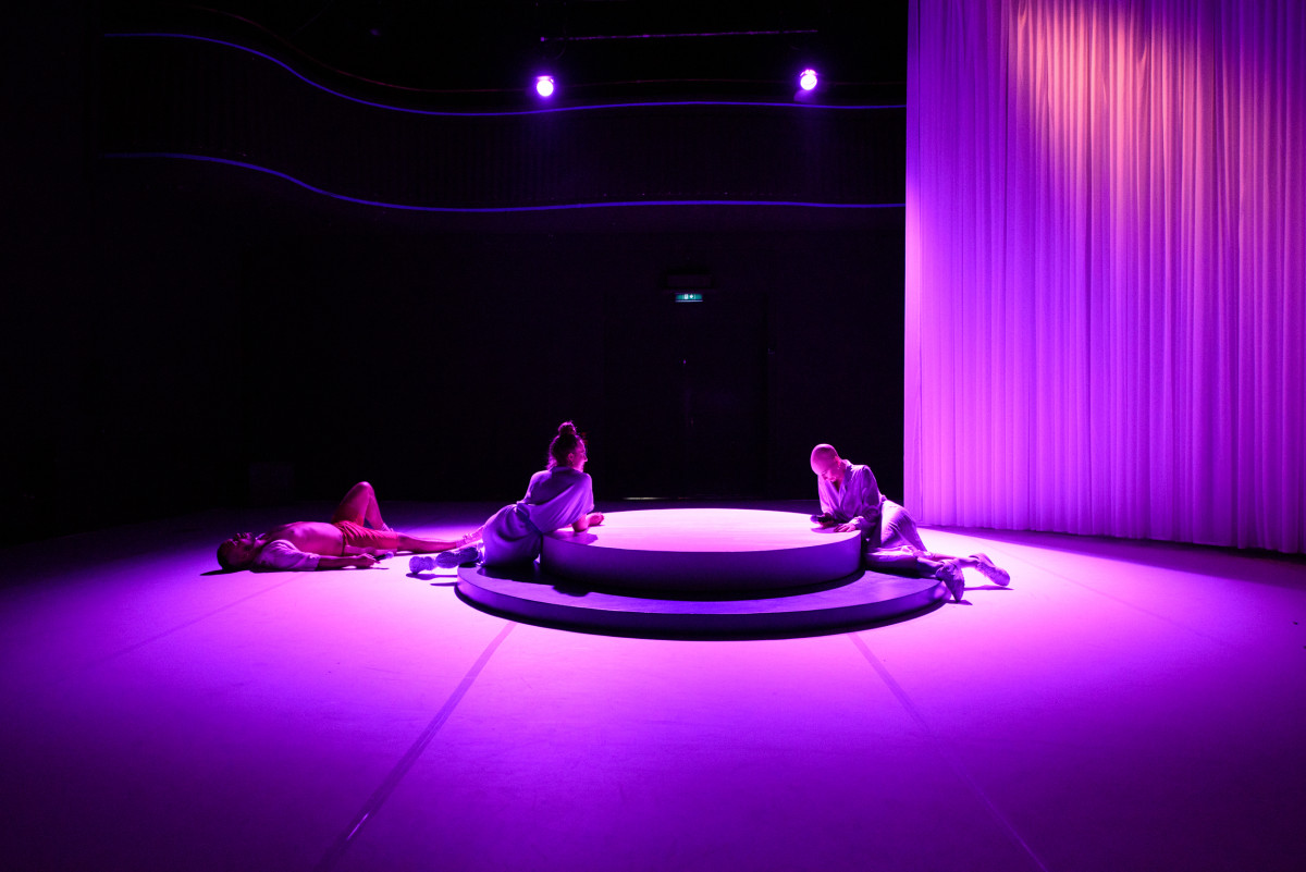 Bildbeschreibung: Das Bild zeigt eine Bühne, auf der sich keine Darsteller*innen befinden. Von der Decke hängt ein langer transparenter Vorhang, der ein kleines rundes Podium in der Mitte der Bühne fast verdeckt. Der Vorhang erzeugt verschiedene Formen im Raum und lineare Schatten auf einer hellen Tanzfläche. Drei Lichtquellen von hinten erzeugen ein warmes, lilafarbenes Licht, das durch den Vorhang scheint. Über die Fläche des gesamten Fotos steht in großen weißen Buchstaben die Bildbeschreibung geschrieben.