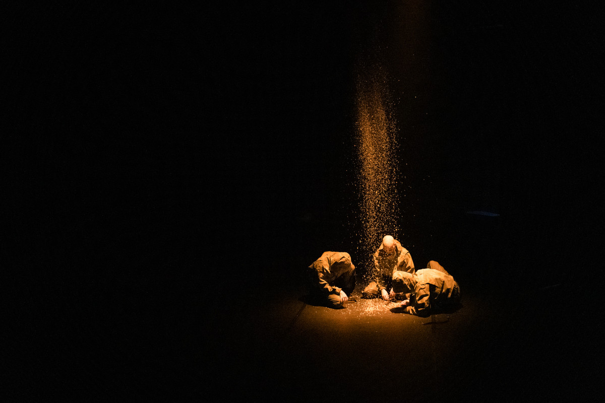 The bodies and voices in MURMUR dive through a continous transformation: they build up different images and forms in a cyclical structure, question themselves concerning their symbolic character and leave traces of sound and movement. The performers become hybrid identities in an alternation of standing still, stuttering and echoing.