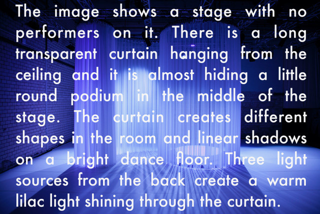 Image description: The image shows a stage with no performers on it. There is a long transparent curtain hanging from the ceiling and it is almost hiding a little round podium in the middle of the stage. The curtain creates different shapes in the room and linear shadows on a bright dance floor. Three light sources from the back create a warm lilac light shining through the curtain. The image description of the photo is written in large white letters across the entire photo.